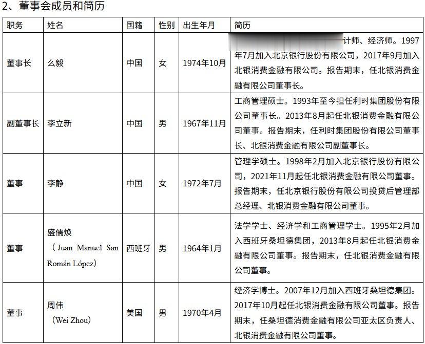 北银消费金融在今年上半年发布了《2024年度信息披露报告》,指出该公司董事会共有董事5名。