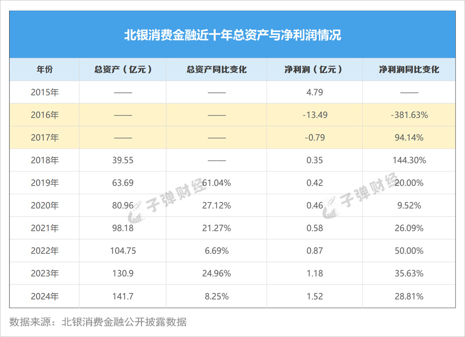 截至2025年6月末,北银消费金融注册资本达到8.5亿元,总资产达154.2亿元,净利润1.02亿元(同比增长50%),而在2024年末其净利润仅排在业内第19名,处于行业下游水平。