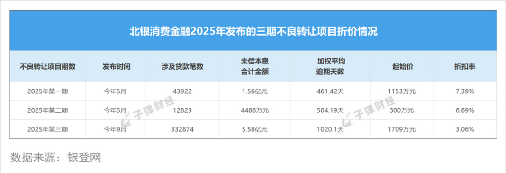 值得一提的是,北银消费金融的资产质量存在一定问题。尽管其未公开披露不良率数据,但2025年在银登网发布了3期的个人不良贷款(个人消费贷款)转让公告,未偿本息的合计总额超过7亿元,可见贷款逾期与催收压力凸显。