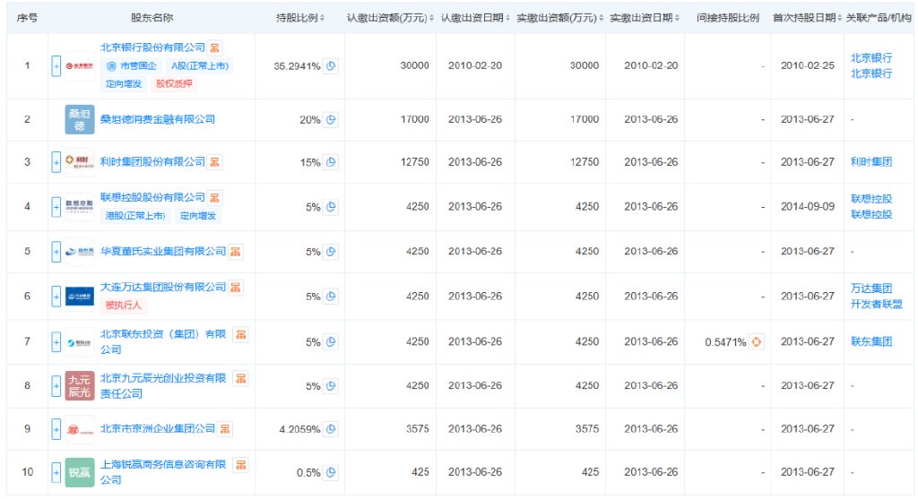2013年,北银消费金融引入了9位新股东,其中西班牙桑坦德消费金融公司凭借着持股20%,成为其第二大股东。此外,联想控股与大连万达集团也出现在股东列表中。