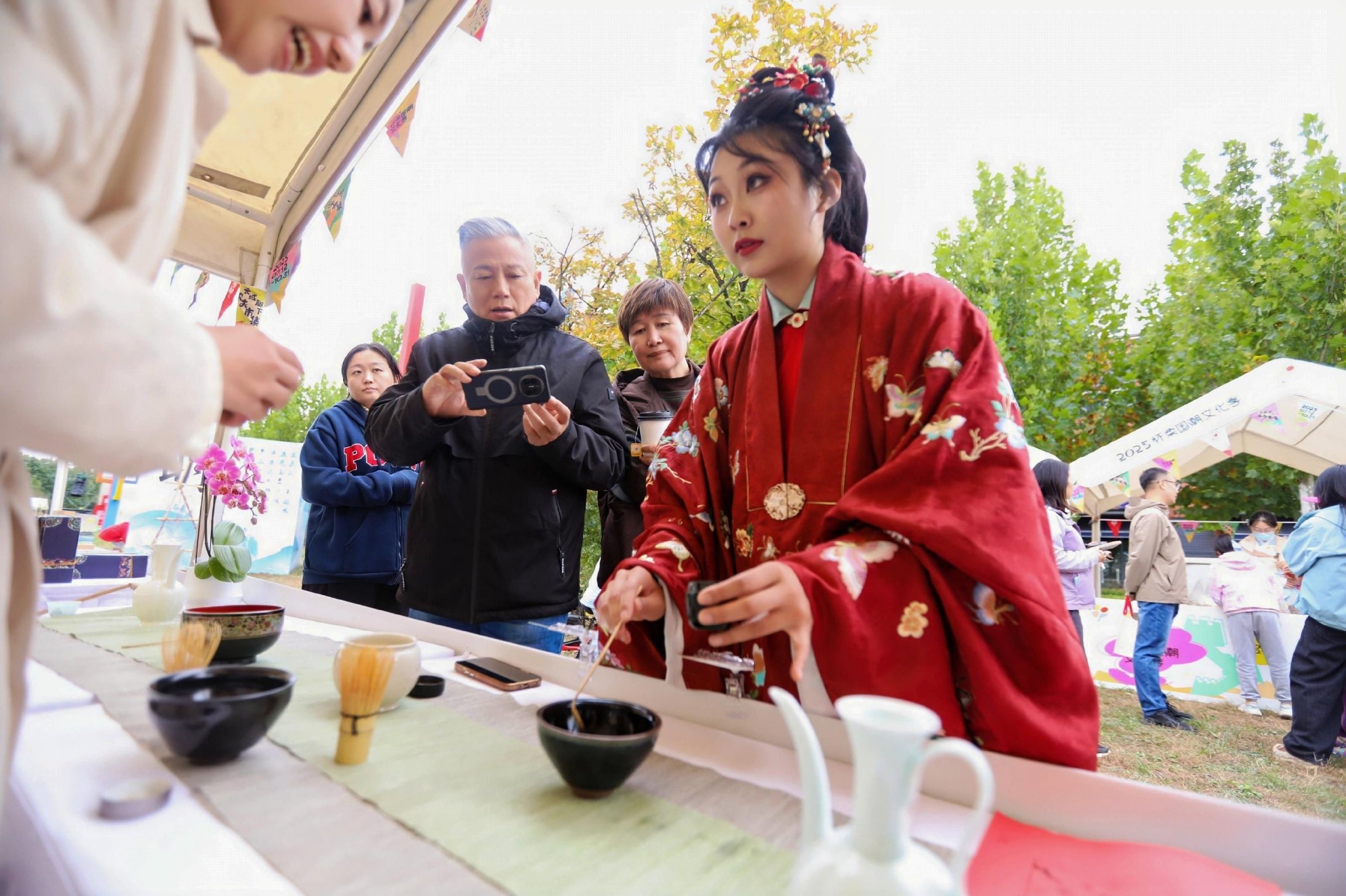 本次非遗市集聚焦“可看、可玩、可体验”,构建了多维度文化互动场景。在汉服文化展示环节,汉服走秀与巡游同步开展,衣袂翩跹间尽显传统服饰形制之美;展板打卡区则结合阅读节主题,设置投壶、蹴鞠、捶丸、射箭等传统运动体验项目,让参与者在趣味互动中感受古人休闲生活。非遗摊位更是市集“重头戏”,宋式点茶、传统花艺、木版年画等项目依次排开,专业指导人员现场教学,游客亲手参与制作,将专属非遗记忆带回家。