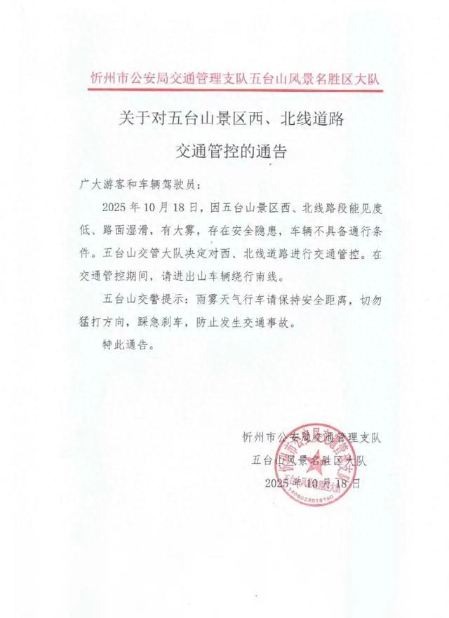 10月18日,忻州市公安局交通管理支队五台山风景名胜区大队发布关于对五台山景区西、北线道路交通管控的通告。因五台山景区西、北线路段能见度低、路面湿滑,有大雾,存在安全隐患,车辆不具备通行条件。五台山交管大队决定对西、北线道路进行交通管控。在交通管控期间,请进出山车辆绕行南线。
