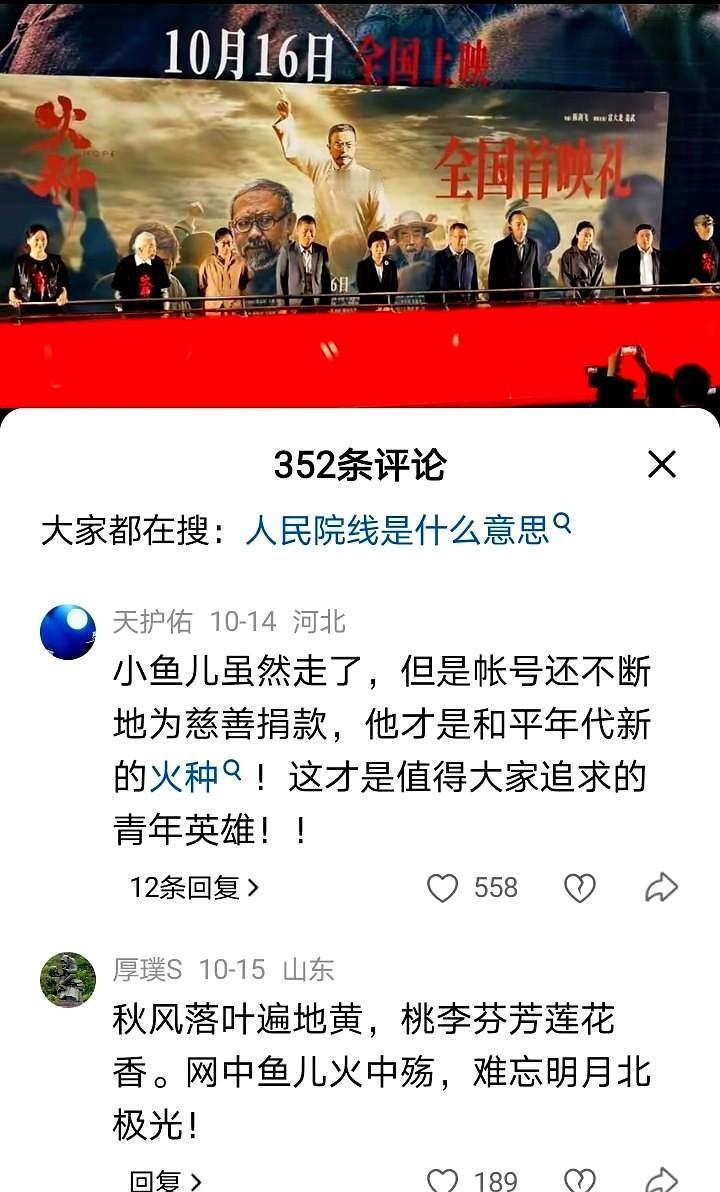 刚看到电影《火种》的一个视频,在下方评论中有一条热评是这样说的:小鱼儿虽然走了,但是账号还不断地为慈善捐款,他才是和平年代新的火种! 这才是值得大家追求的青年英雄! 我不知道其中的意思,什么小鱼儿走了还有账号捐款,这是梗吗? 网友对此说道: 10.19可以搜一下上海浦东这家影院奇怪的售票情况,只有工作日的午夜场满票,其他场次空无一人? 这片子是拍给看的? 不坚持,怎么知道行不行呢,所以一定要坚持,加油坚持下去 微信上查了查,湖南长沙开福区天心区三家影院上了这部电影,排的场次也不多,我家这个区没有排期。 反手再来一个影评:半颗星1分。 急的我哟,1分都嫌多 转发一篇有意思的文章,不知道哪个网友这么有才! 范医生:小杜,小杜,准备做手术了,宋灵车到了吗? 快来不及了。 剖下来的东西要扔哪? 田里还是苑里? 我们会不会被说成事不足败事有余啊? 不要胡说,放心,其他人也不需要焦虑。 非常辛苦大家完成这项KPI,在这之前,请大家留下方便的时间,高高兴兴地一起吃饭吃菜。 饭后还有大家喜欢的芒果粥。