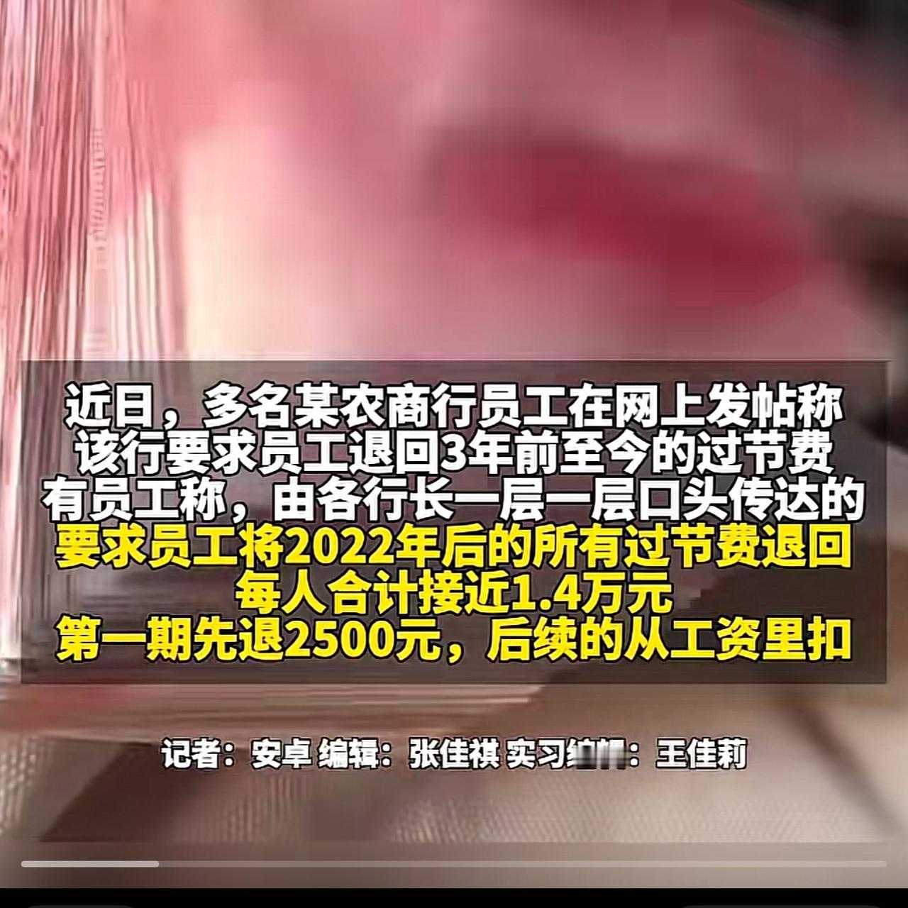 “为退还三年过节费的员工点赞,员工格局大,企业才能走的更远”,近期广州农商行因为内部的决策,由领导一级一级的口述,让员工把过去三年的过节费退还,每人合计1.4万元,第一期先退2500元,从员工工资扣除。并且绝大部分员工理解并支持,首先要为这些员工主动和公司共进退的精神比个心,实在是太有格局,而把这些暴露出来的员工可见就是自私自利,如果一个公司倒下了,受损的还是员工,真不明白这些人为什么都想不到这个核心点。也希望该银行能好好的守住这些退款员工的善意,当公司有起色的时候,进一步的感谢他们,并且付出实际行为。大家请为这些员工点个赞吧。
