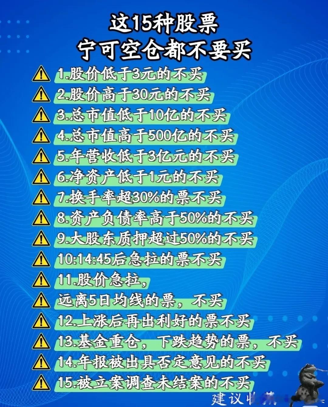 1. 股价低于3元的不买 —— 可能是低价垃圾股,风险极高。