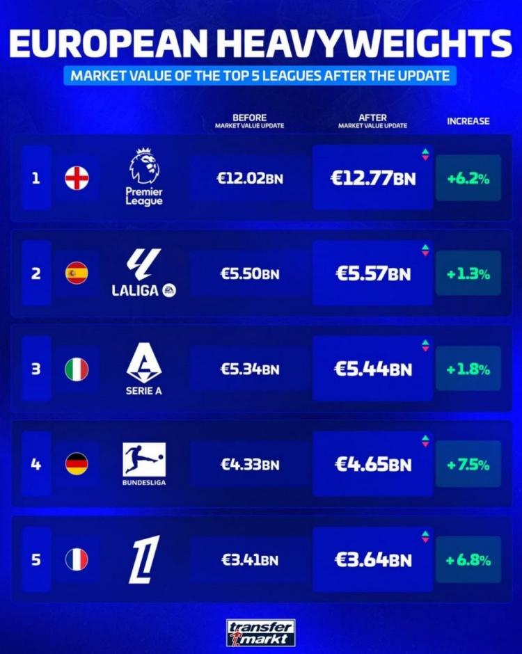 直播吧10月20日讯德转此前更新了足坛球员身价,并盘点了五大联赛球队总身价榜,其中英超遥遥领先,以下为具体情况: