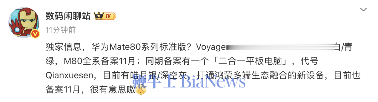 该博主透露,一款代号为Voyager的新机备案完毕,疑似华为Mate80系列标准版。