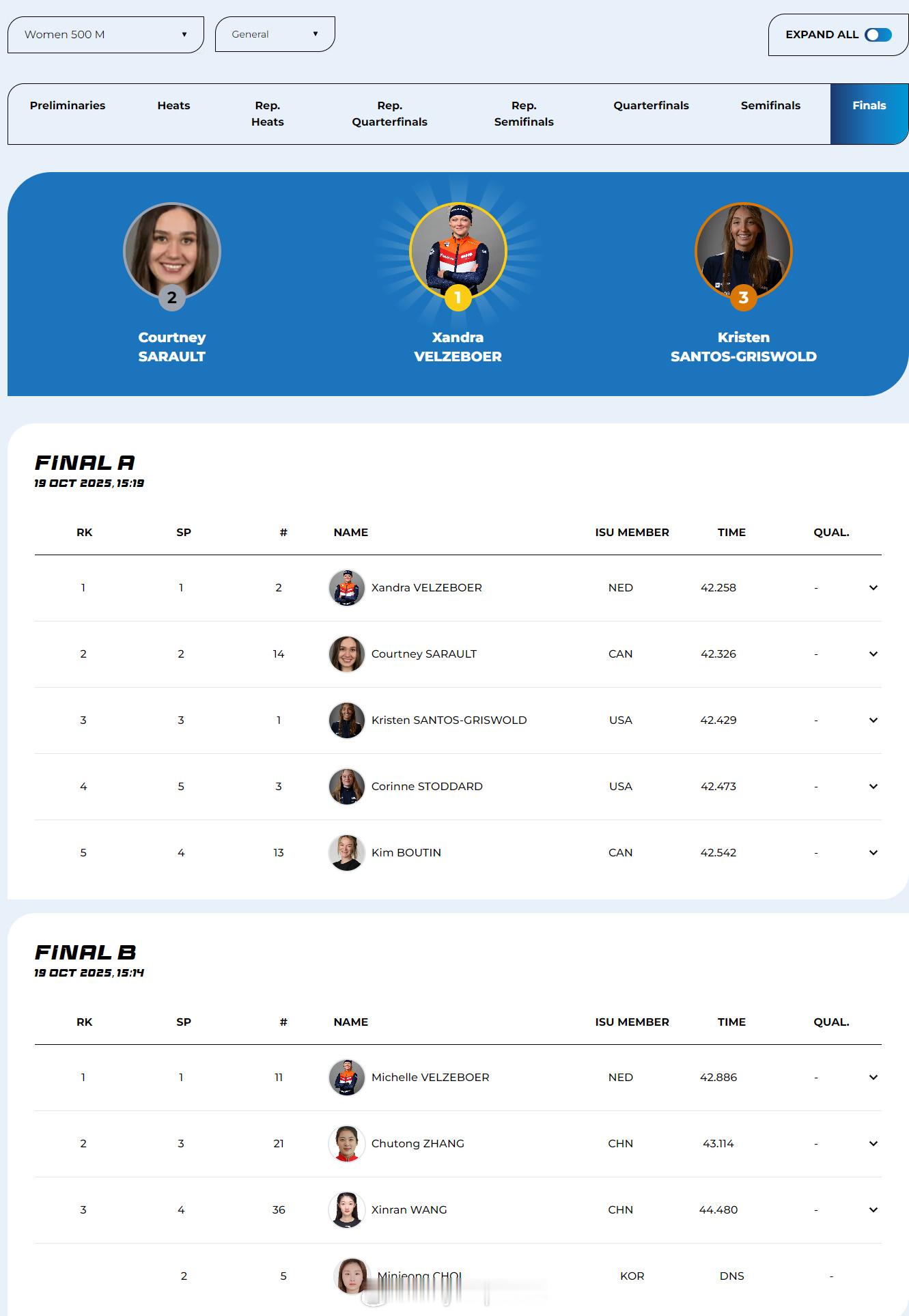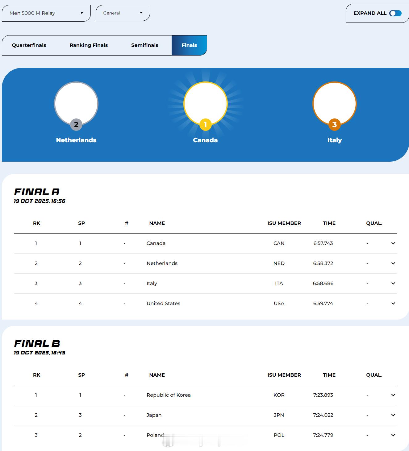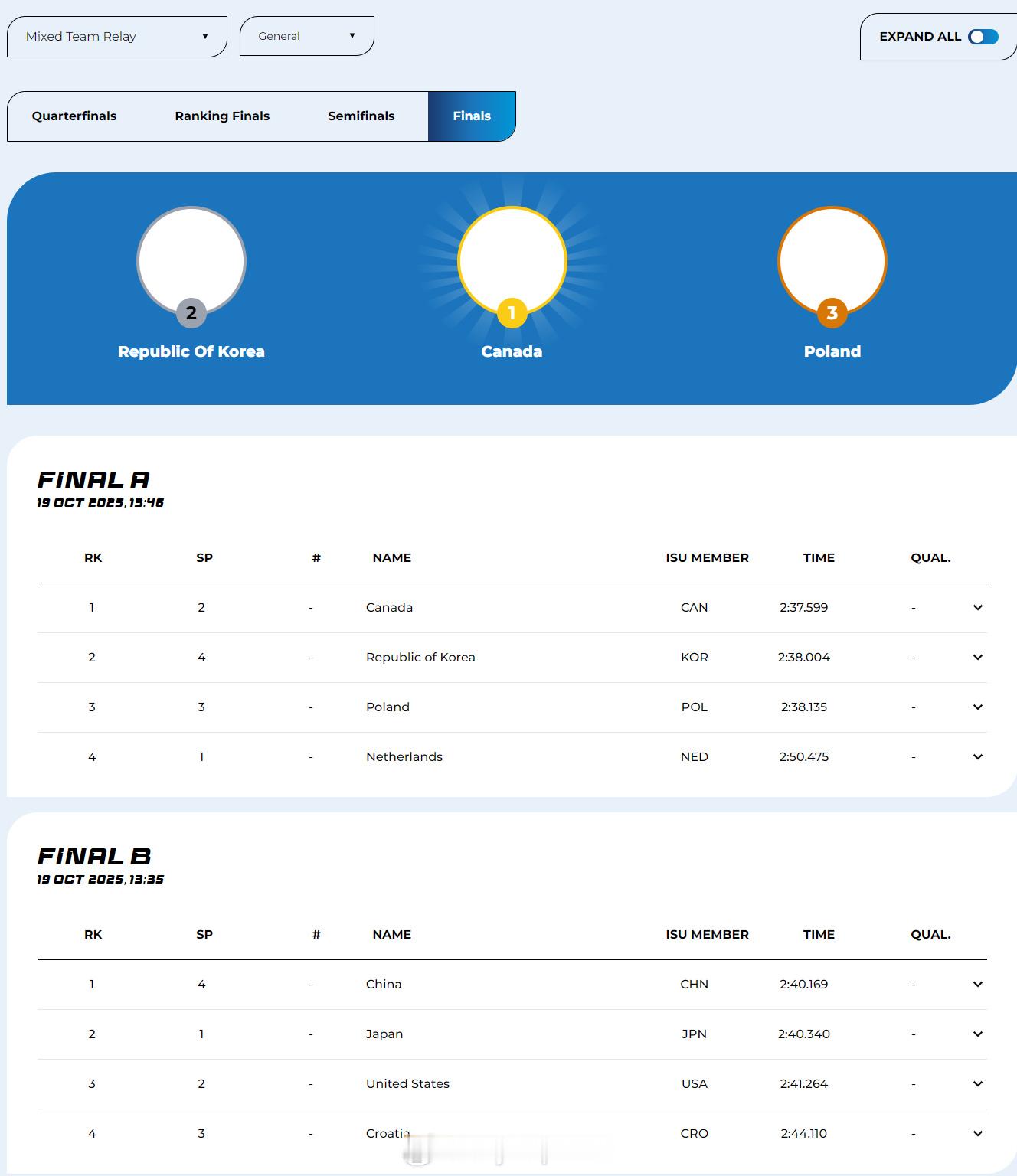 【短道世巡赛加拿大再夺三金 丹吉努包揽男子单项冠军】世巡赛第二站中国队1银1铜收官世巡赛第二站加拿大队7金短道速滑世界巡回赛 10月19日蒙特利尔,短道速滑世巡赛第二站落幕。在最后一天的比赛中,东道主加拿大再夺三金,包括混合2000米接力和男子5000米接力。在男子1000米比赛中封王的丹吉努在本站比赛包揽了三个单项的全部冠军。荷兰的X-维尔泽波尔和韩国崔珉祯分获女子500米和1500米金牌,中国队没有选手进入今天比赛的A组决赛。
