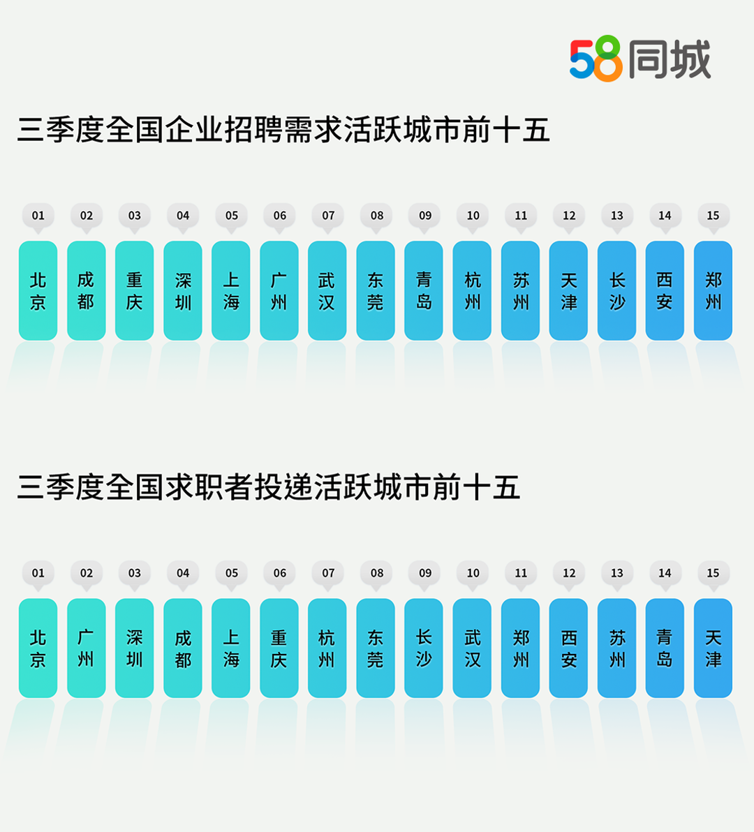今年三季度,各地各部门加大稳岗惠企支持力度,加上消费市场活力涌动,求职者投递简历的积极性更高。10月20日,据58同城发布的2025年三季度人才流动数据显示,全国招聘需求环比增长3.4%,北京、上海、青岛等城市招聘需求环比涨幅超10%。招聘需求增长进一步印证,就业市场有回暖迹象。
