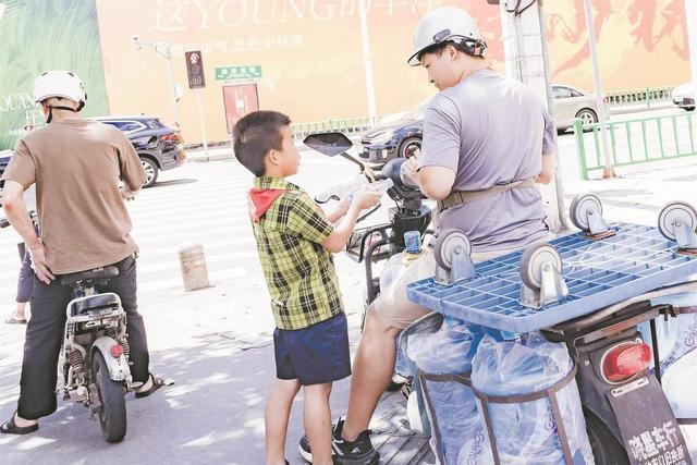 参与爱心冰柜活动的孩子为高温下的劳动者送水