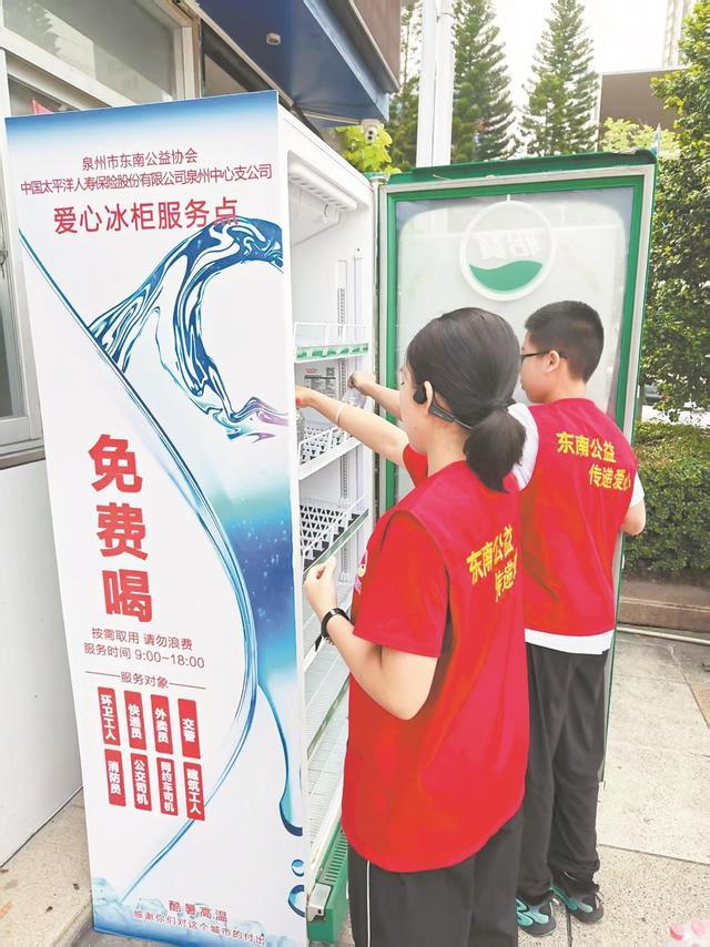 活动期间,爱心冰柜成为连接社会爱心与一线劳动者的桥梁。众多志愿者默默付出,确保冰柜供水充足。他们不仅及时补水,还热情邀请劳动者到附近驿站休息。众多学生志愿者也积极参与这场清凉接力。泉州聚龙外国语学校初一年级学生李嘉玺会在暑假里定好闹钟,早早地来到泉州商城志愿服务驿站参与爱心冰柜志愿服务,暑假期间累计服务60多个小时。大学生李玮祺多年坚持来驿站做志愿服务,今年暑期他和返乡大学生苟骏一起带领学生志愿者定时定量给爱心冰柜补水,引导大众文明取水。此外,一名男子多次骑车送来几箱矿泉水补充到爱心冰柜。偶然间被志愿者遇到时,他也没有留下只言片语,只有来去匆匆的身影。志愿者和爱心人士用真诚的善意向这些高温下的“城市英雄”致敬并提供服务。