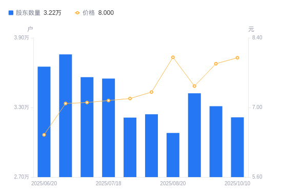日期A股户数(户)流通A股户均持股数(股)户均持股市值(万元)2025-10-103215210058.198.052025-09-10331079768.057.702025-08-29342229449.797.022025-08-203080910496.638.412025-08-08324209975.047.292025-07-313212810065.707.232025-07-18354949111.146.512025-07-10356179079.686.452025-06-30375828604.946.092025-06-20365198855.415.71