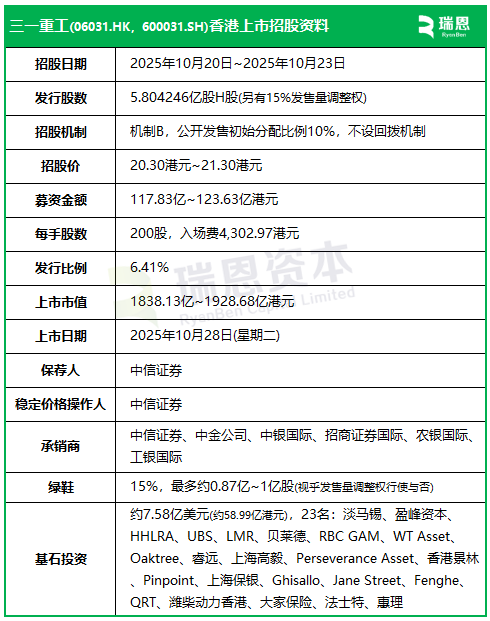 全球工程机械领军企业、A股上市公司三一重工(06031.HK,600031.SH),于今日(10月20日)起至周五(10月23日)招股,预计2025年10月28日在港交所挂牌上市,中信证券独家保荐。