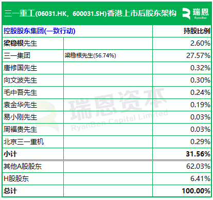 招股书显示,三一重工在香港上市后的股东架构中,梁稳根先生,直接持股2.78%;梁稳根先生拥有56.74%权益的三一集团持股29.46%。根据一致行动安排,控股股东集团其他成员须按照三一集团的意见及决定投票,控股股东集团合计持股约31.56%。其他A股股东持股62.03%,H股股东持股6.41%。