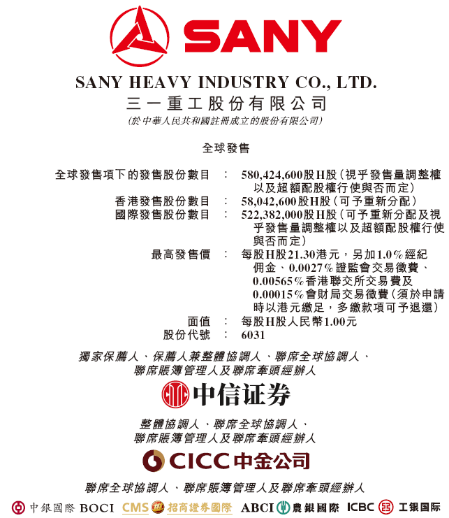三一重工是次IPO,中信证券为其独家保荐人,其他承销商包括中金公司、中银国际、招商证券国际、农银国际、工银国际。
