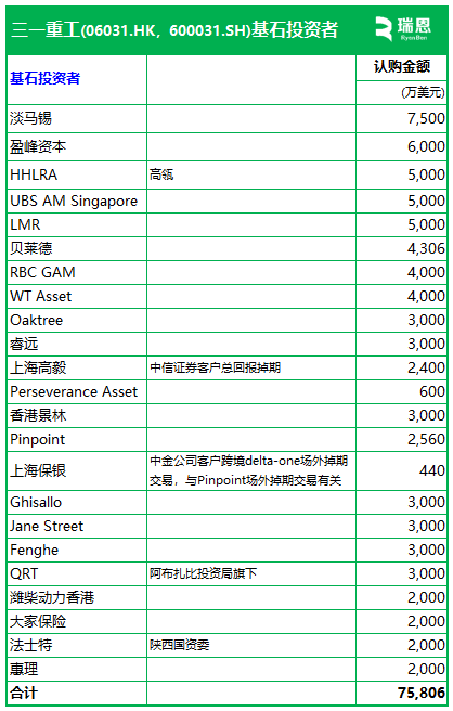 三一重工是次IPO招股引入23名基石投资者,合共认购7.58亿美元(约58.99亿港元)的发售股份,基石投资者包括淡马锡、盈峰资本、HHLRA、UBS、LMR、贝莱德、RBCGAM、WTAsset、Oaktree、睿远、上海高毅、PerseveranceAsset、香港景林、Pinpoint、上海保银、Ghisallo、JaneStreet、Fenghe、QRT、潍柴动力香港、大家保险、法士特、惠理等。