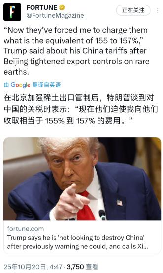 特朗普:“我不想摧毁中国” 美国特朗普昨晚(北京时间10月19日晚)告诉福克斯新闻,他“并不想摧毁中国”,并指出他在第一个任期内征收了“数千亿美元”的关税。特朗普表示,新的关税现在相当于155%至157%,并称中方愿意达成协议。他计划两周后与中方在韩国会面。   这哪是在谈生意,分明是在演滑稽戏啊!先说说他的关税“战绩”,特朗普第一任期确实对中国商品加征了关税,但这些钱根本没进美国老百姓的口袋,反而全让美国企业和消费者买单了。   纽约联邦储备银行的研究显示,特朗普的关税政策让美国股市市值蒸发了4.1万亿美元,美国经济每年净损失160亿美元。说白了,他所谓的“数千亿关税”,其实是美国自己人掏的腰包。   现在他又说新关税涨到了155%到157%,这更是离谱。根据财新网的报道,2025年美国对华关税叠加后实际是154%,而且这还不包括特朗普第一任期和拜登政府时期的关税。特朗普这么夸大其词,无非是想给自己脸上贴金,显得自己有多厉害。   再看看他的谈判“诚意”,特朗普一边说“不想摧毁中国”,一边又威胁要加征100%的关税,还对中国船舶加收港口服务费。这种“边谈边打”的套路,中方早就看透了。   就在他放话要在韩国会面的同时,中方宣布对涉美船舶收取特别港务费,初期每净吨400元人民币,最高涨到1120元。这一记反制,直接打在了美国的痛处。   美国美森航运公司的“曼努凯”号货轮,就因为停靠中国港口被收取了446万元的费用。面对中方的强硬态度,特朗普又开始服软,承认中国“非常强大”,还说高关税“不可持续”。这简直就是“纸老虎”的真实写照,遇强则怂。   特朗普的对华策略说白了就是“三板斧”:加关税、搞制裁、喊口号。他以为靠这些就能让中国屈服,却不知道中国早就不是当年的中国了。2025年,中国对美出口占比已经跌破10%,但出口总额却不断增长。   中国还加强了稀土出口管制,全球92%的稀土分离与加工产能都在中国,这直接卡住了美国军工和高科技产业的脖子。美国国防部也承认,重建本土稀土产业链至少需要十年。在这种情况下,特朗普还想靠关税来威胁中国,简直是异想天开。   更可笑的是,特朗普连自己的盟友都搞不定。他对韩国、墨西哥等盟友也加征关税,导致这些国家怨声载道。韩国四大财阀组团访美,表面上是打高尔夫,实际上是想让特朗普放宽关税限制。连盟友都不支持他,特朗普的“美国优先”政策,其实是在孤立美国自己。   特朗普口口声声说要和中方在韩国会面,但中方的态度很明确:“谈,大门敞开;打,奉陪到底”。10月18日,中美经贸牵头人举行视频通话,同意尽快举行新一轮磋商,但前提是美方要拿出诚意,取消不合理的关税和制裁措施。   如果特朗普还是抱着“极限施压”的老一套不放,谈判肯定不会有任何结果。   特朗普的“不想摧毁中国”其实就是一句自欺欺人的空话。他不是不想摧毁中国,而是根本没有这个能力。   中国有14亿人口的大市场,有全球最完整的工业体系,有自主创新的科技实力。特朗普的关税大棒,不仅打不倒中国,反而会让美国自己陷入更深的经济危机。   从泽连斯基自导自演欢迎仪式,到特朗普的关税“嘴炮秀”,这些西方国家的领导人,为了自己的政治利益,真是无所不用其极。但谎言终究是谎言,事实胜于雄辩。   中国不会被任何威胁吓倒,我们有信心、有能力应对任何挑战。特朗普如果真的想改善中美关系,就应该放下身段,拿出诚意,回到平等协商的轨道上来。否则,他的“演员”生涯,只会以失败告终。