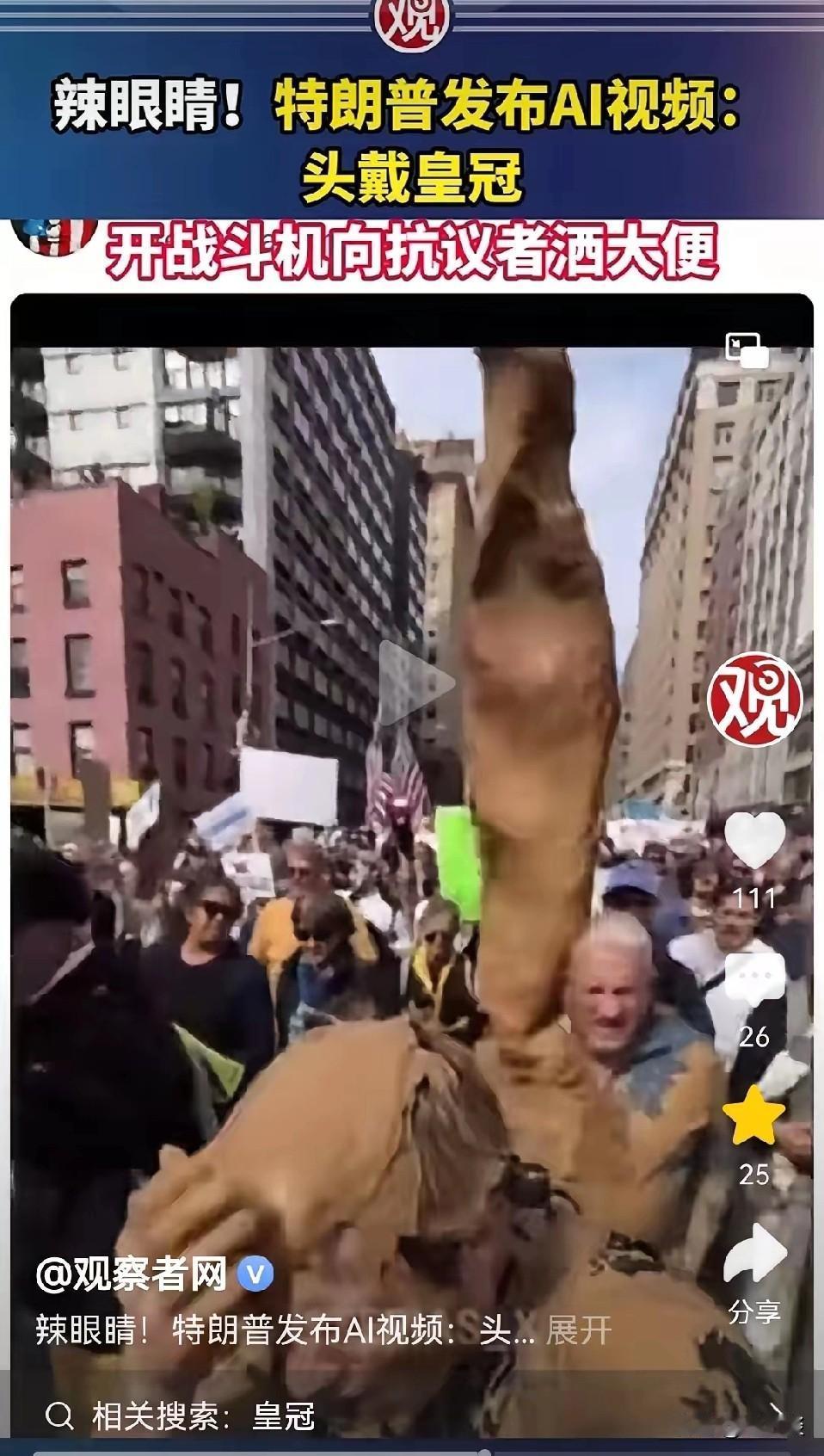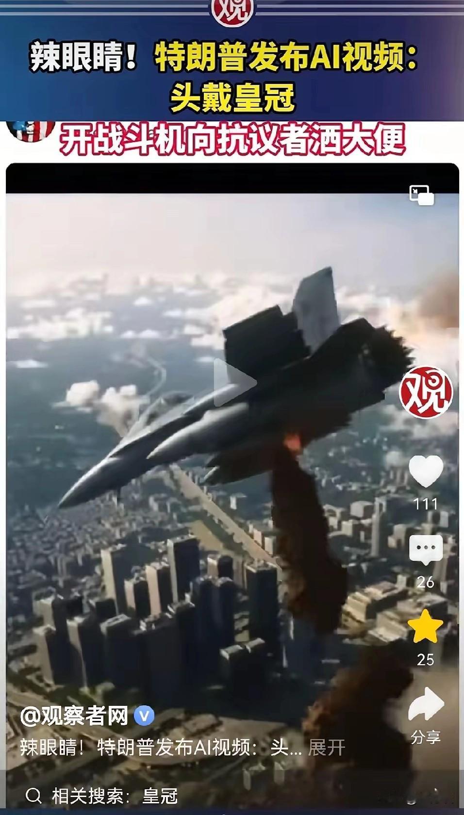 特朗普应该是美国历史上最搞笑的总统再也没有哪一位总统有特朗普如此的搞笑功能了?面对几百万人对他执政的愤怒而正在全国进行的游行示威,特朗普做了一个AI视频,他头戴皇冠,驾着轰炸机载满了满满的大粪,朝游行示威的人群撒过去,只见游行的人群狼狈不堪真的是恰如其粪! 特朗普看似以轻松的姿态来化解当前的尴尬,但是特朗普的这个行为,只会更加的激怒不满的民众,对他的指控只会有增无减,面对愤怒的人群,特朗普稳坐钓鱼台,不为所动。因为这些民众拿特朗普也没有办法,他们又不能直接罢免特朗普,所以只能通过游行,来表达自己内心的愤怒,但是仅此而已,所以特朗普才会有如此悠闲的心态,来看待游行的民众。反正现在美国就是你愤怒你的,我当我的总统,大家互不干扰。