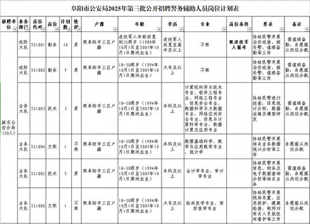 大皖新闻讯10月20日,记者获悉,阜阳市公安局根据工作需要,面向社会公开招聘115名警务辅助人员。具体岗位及相应条件见《阜阳市公安局2025年第三批公开招聘警务辅助人员岗位计划表》。