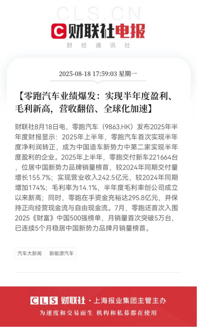 零跑再传利好!创始人朱江明新一轮增持,累计增持金额约8.5亿港元! 10月20日,零跑汽车官方发布公告,零跑汽车(9863.HK)创始人、董事长兼CEO朱江明及股东傅利泉进行了新一轮增持,他们于市场内合共购入324.35万股本公司H股,总金额超2亿港元。加上此前的增持份额,朱江明及傅利泉合计增持金额已经来到了约8.5亿元港元。 而之所以选择在这个时间段进行再次增持,综合分析来看,确实是因为今年零跑发展太好了。比如销量,自3月以来,零跑连续7个月稳居新势力销冠,上个月交付首次突破6万台,创造中国新势力月度新纪录。截止9月底,零跑更是官宣了100万台整车下线,成为第二家完成该成就的新势力。就在上周,零跑又趁热打铁,发布了最新的零跑旗舰D平台技术,以及零跑D19的全球首秀。 营收入方面,根据此前零跑发布的半年度财报可以得知,今年上半年零跑已实现首次半年度净利润转正,成为中国新势力第二家正式半年度盈利的车企,公司现金储备充足,经营现金流持续为正,企业发展稳中向好。 总之,两年三次增持,可见朱江明自身对于零跑十分看好,也是给消费者、给资本市场吃下的一颗定心丸。