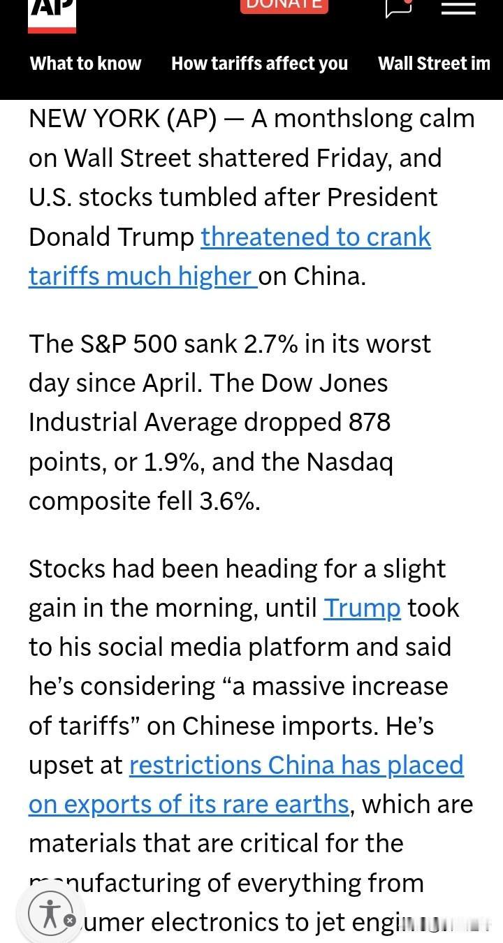 标普500下跌2.7%,纳斯达克下跌3.6%。 川普写了一篇长文(发不出来),大概内容是说东大在稀土出口政策上有敌意,鉴于如此,美国将自2025年11月1日起对东大产品再次全面加征100%关税。 川普还说:“尽管可能痛苦,但这对美国来说,在最后,将是一件非常好的事情”。[抠鼻][惊呆] 加征100%关税