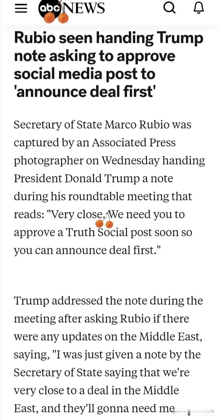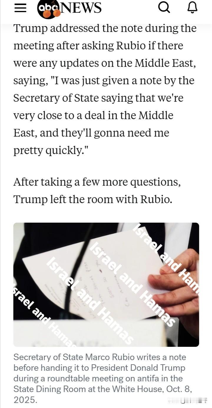 10月8日白宫反反法西斯圆桌会议上,卢比奥给川普递了个纸条,并耳语几句,随后两人出去了。过会儿川普回来后在其个人社媒Truth Social上宣布:“以色列与哈马斯都已同意签署和平协议方案的第一阶段。哈马斯释放所有人质,以色列释放被关押的巴勒斯坦人,以色列同意将军队撤回到双方同意的边界线”。 卢比奥递给川普的纸条上这样写:协议很快就要达成了,我们需要你批准一条要发在Truth Social上的帖子,好让你能第一时间宣布这个消息”。 川普周五将去埃及商讨和平协议事宜。 以色列首席谈判代表已抵达埃及,川普的中东特使维特科夫和库什纳也已抵达埃及。 就在川普宣布这些的同时,以色列仍旧在轰炸加沙。🤔 哈马斯