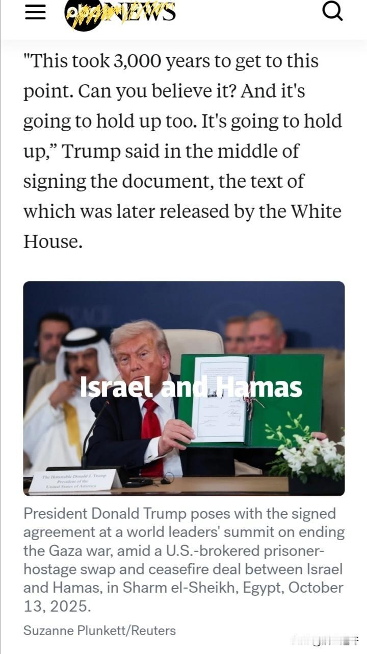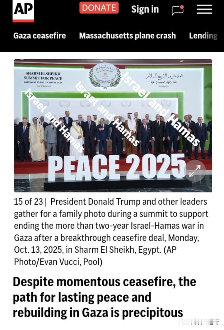 🖊以色列释放两千多名被监禁的巴勒斯坦人,哈马斯释放剩余活着的人质,死亡人质遗体只还了四具,其他的据称还未找到。 🖊川普在埃及与20多位世界领导人举行中东和平峰会,签署了和平协议,没有内塔,也没有哈马斯。没有内塔是因为土耳其、西班牙、南非和伊拉克等国家的抵制。巴勒斯坦权力机构主席阿巴斯代表巴勒斯坦人出席会议。 🖊和平协议内容没有公布,内容不详。 🖊“为了走到今天这一步我们花费了三年,你能相信吗?它会坚持下去的”。川普签署和平协议备忘录时这样说。 巴勒斯坦 中东和平协议 加沙 中东