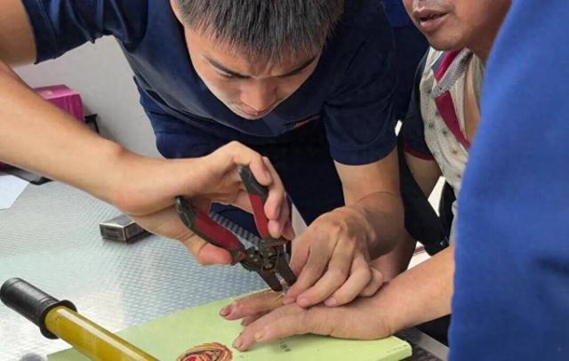 消防救援人员接到求助后,立即对男子的手部情况进行仔细查看,随后小心翼翼地将剪切钳对准戒指,凭借丰富的救援经验和精准的操作技巧,对戒指进行剪切。最终,戒指被成功剪断并取下。