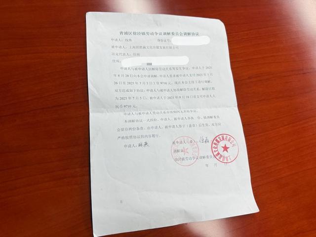 记者在钱燕提供的《劳动争议调解委员会调解协议》上看到:申请人(钱燕)与被申请人(联胜赢)因解除劳动关系等发生争议,申请人于8月20日申请调解,要求被申请人支付2025年5月26日至2025年7月3日工资9710元。经调解,双方达成协议:被申请人于2025年9月16日前支付申请人人民币9710元。该协议有钱燕和任雨的签名落款,以及属地劳动争议调解委员会和联胜赢的盖章。