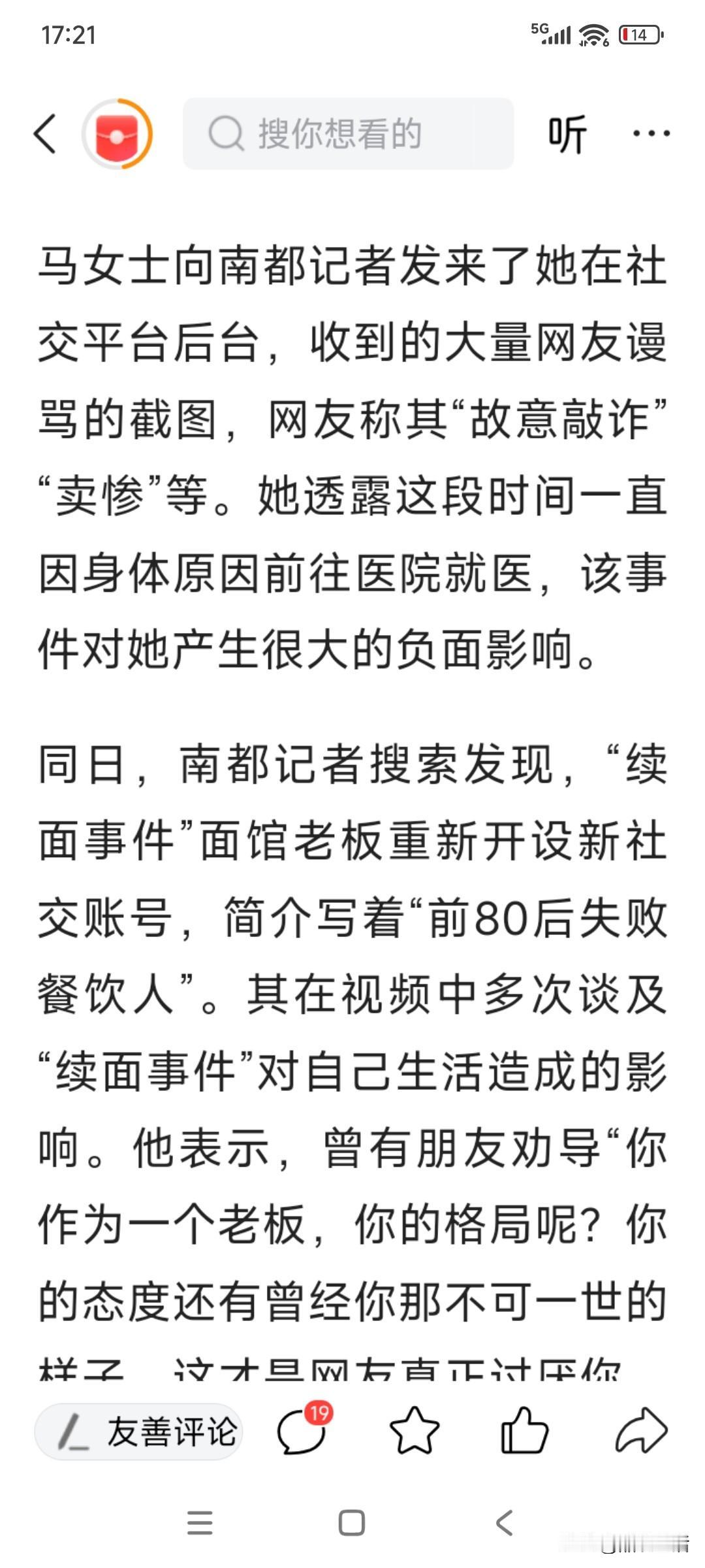 续面,后续!霍某面馆4家店,已经关停了3家,马女士近日,说始终没有等到道歉!要诉/诸法/律!自己和家人还被霍某以前的言论影响,有些人打电话,说自己是“敲诈”,还有人说是“卖惨,”已经“抑/郁”了! 当初,霍某面馆接待马女士一家,说她们7口人,花70元,只点了一碗面,还多次续面, 马女士晒出账单,当天消费140元,并不只是一碗面! 于是舆/论反转,大家都指责霍某,不地道。人家消费了有羊肉串,和羊排,共140元,还不能续两次面吗?一碗面的成本才2-3元! 后来霍某,直/播,又晒当初吃面视频,小孩子也没打/码,并去隔壁找马女士一家,还说她们一家是“七匹狼”, 霍某,被网/暴,面馆就经营不下去了,8.15日,霍某出来表示,会道歉,已经和解了! 霍某本来有4家饸烙面馆,却因为“续面风波”。已经有3家关门了,只有一家正常经营! 不知道为啥,正当大家都快遗忘了,马女士,又出来说“续面”的事,并说一定要霍某道歉? 霍某,面馆都黄了3家,只剩下一家,他父亲就在做面,到他这一代,也是以饸烙面为生,得饶人处且饶人吧? 大家认为呢? 别回头马女士,要直播带货了? 你会去买吗?