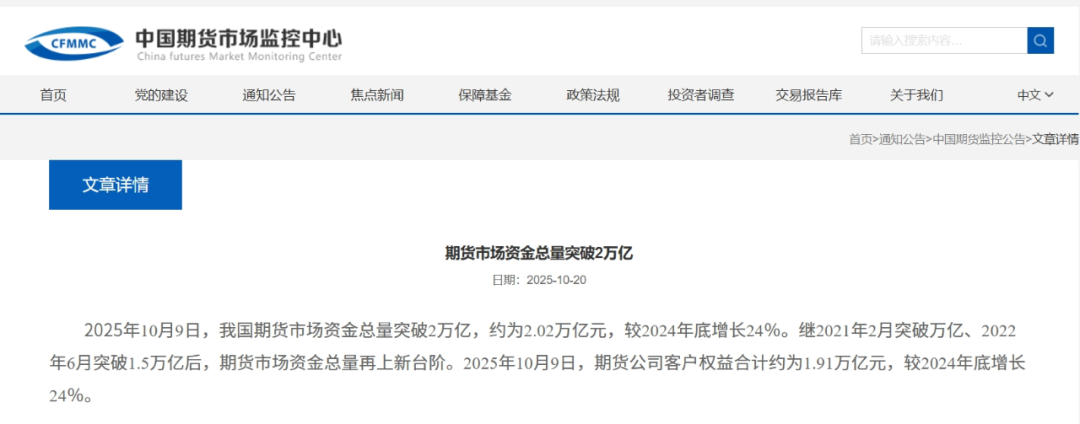 10月20日,中国期货市场监控中心发文称,2025年10月9日,我国期货市场资金总量突破2万亿元,约为2.02万亿元,较2024年底增长24%。继2021年2月突破万亿、2022年6月突破1.5万亿后,期货市场资金总量再上新台阶。2025年10月9日,期货公司客户权益合计约为1.91万亿元,较2024年底增长24%。