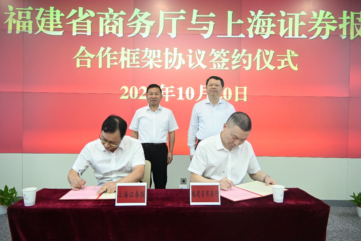 上证报中国证券网讯(叶子申记者闫婧)10月20日,闽东榕城,福建省商务厅与上海证券报社签署合作框架协议。双方将在开展信息推广和品牌建设、加强福建投资促进活动合作、加强渠道共建与信息资源共享等方面开展深度合作,助推福建招商引资工作,服务经济高质量发展。