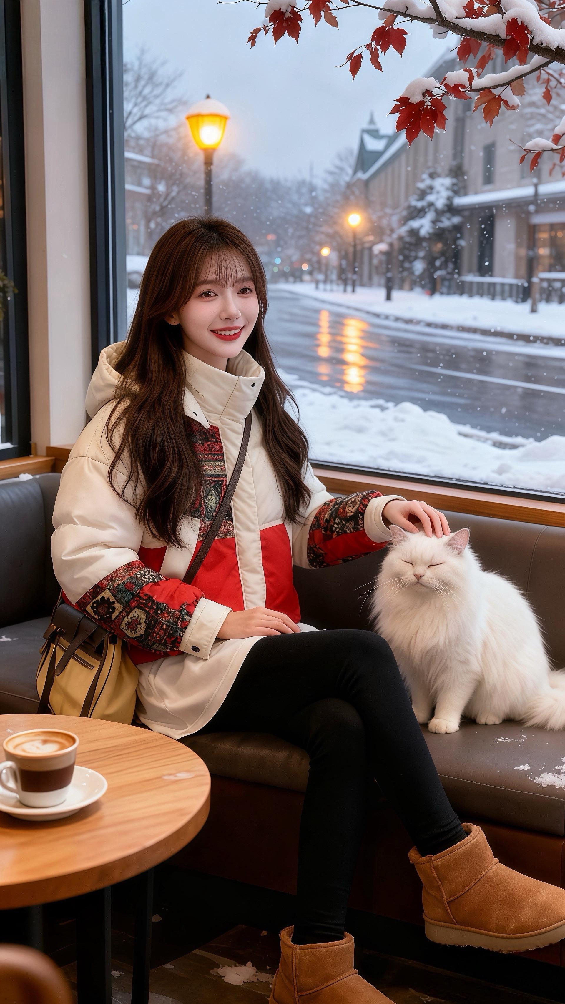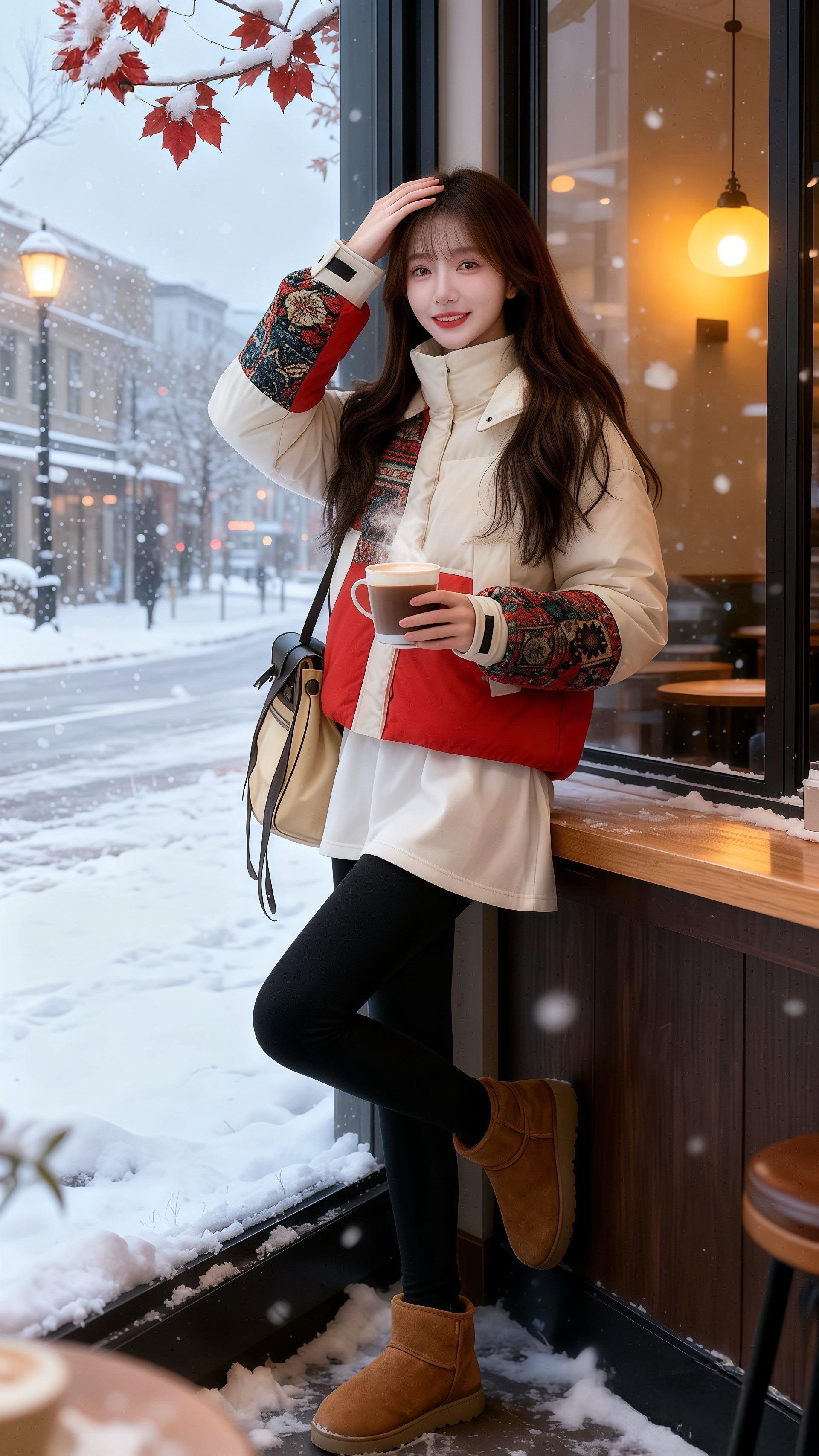初雪漫天时,许妍靠在咖啡店窗畔,米白与红撞色的棉服衬得她在雪景里格外亮眼,袖口的复古纹样似是藏了一段异域故事。她指尖捏着温热的拿铁杯,目光却被画廊方向走来的男人吸引。