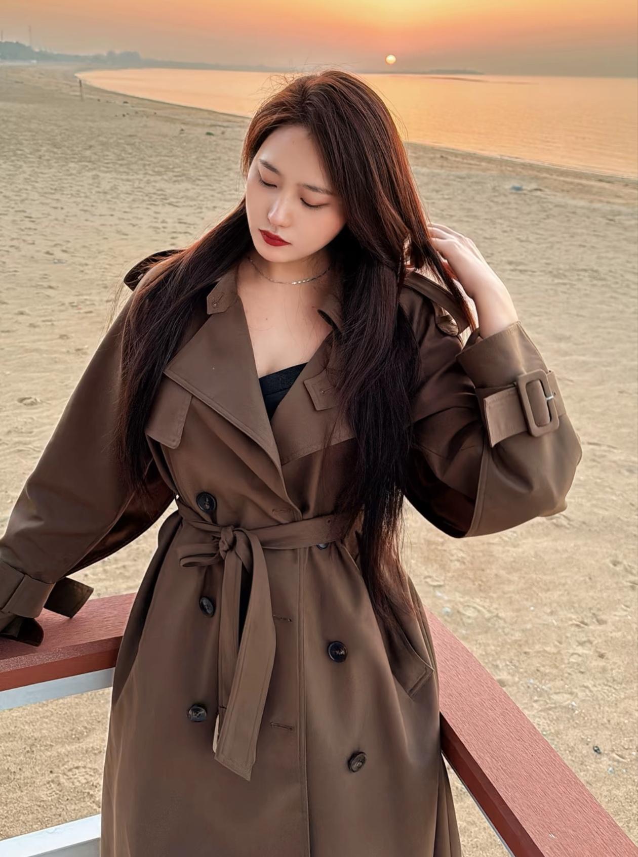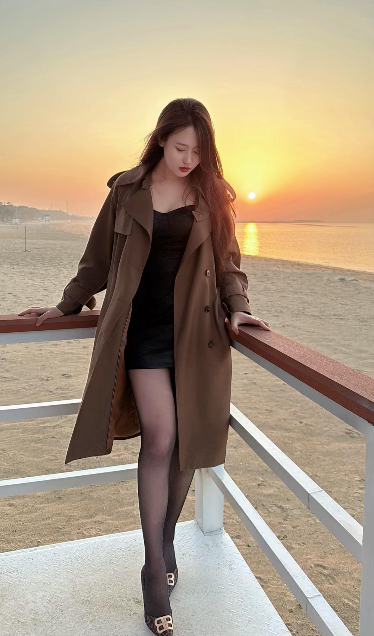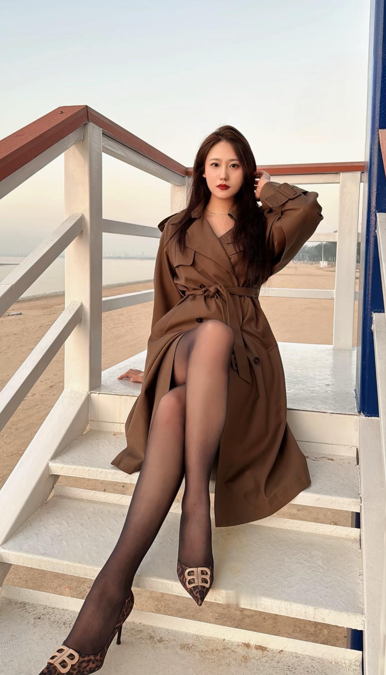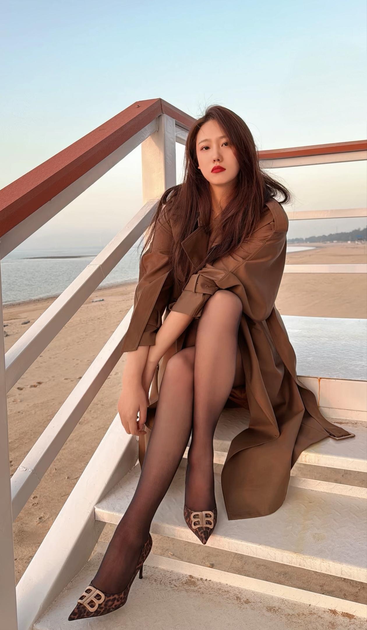 海边漫步,优雅穿搭,红唇与海风相得益彰。