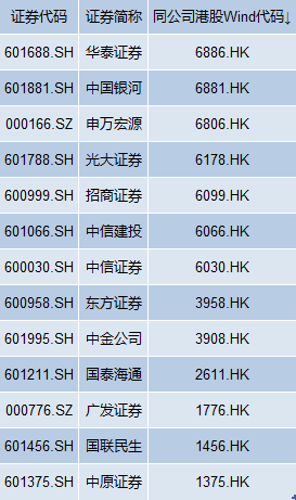 Wind资料显示,目前全市场共有13家“A+H”上市券商,分别为华泰证券、中国银河、申万宏源、光大证券、招商证券、中信建投、中信证券、东方证券、中金公司、国泰海通、广发证券、国联民生、中原证券。