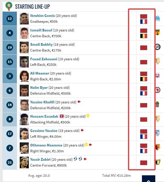 摩洛哥世青赛决赛首发:6人双重国籍,4个法国裔+2个比利时裔