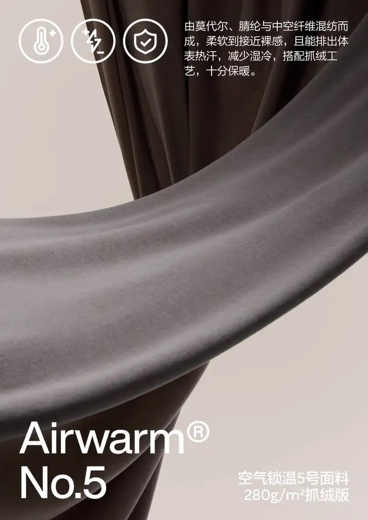 蕉内专利Airwarm®空气锁温技术,通过科学组合腈纶、莫代尔等纤维,在纱线与面料内部形成中空结构。这种特殊构造能牢牢锁住人体周围的静止空气,阻止热量随空气流动流失,实现“热量不逃逸,温暖更持久”的效果。