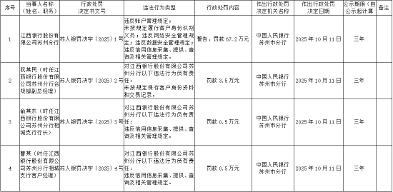 10月21日金融一线消息,中国人民银行苏州市分行行政处罚决定信息公示表显示,江西银行苏州分行因违反账户管理规定;未按规定履行客户身份识别义务;违反网络安全管理规定;违反数据安全管理规定;违反信用信息采集、提供、查询及相关管理规定,被中国人民银行苏州市分行警告,罚款67.2万元。
