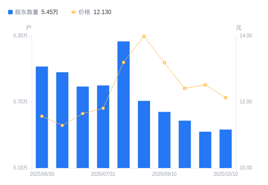 日期A股户数(户)流通A股户均持股数(股)户均持股市值(万元)2025-10-105450016813.5820.392025-09-305430016875.5021.132025-09-195530016570.3420.562025-09-105610016334.0421.542025-08-205710016047.9822.452025-08-086250014661.4419.352025-07-315850015663.9318.502025-07-185840015690.7518.282025-07-105970015349.0817.332025-06-306021815217.0417.61