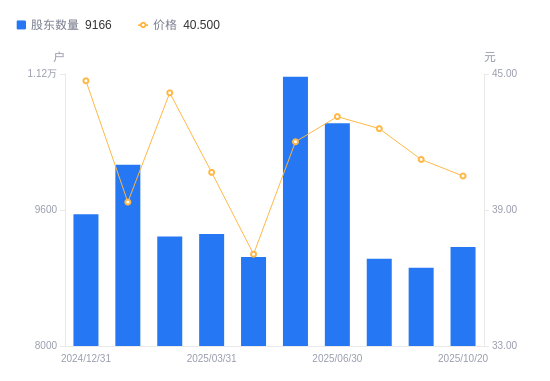 日期A股户数(户)流通A股户均持股数(股)户均持股市值(万元)2025-10-2091662317.249.382025-10-1089212380.889.822025-09-3090272352.9210.022025-06-30106211999.808.622025-06-20111681901.857.992025-05-3090472347.728.702025-03-3193182279.449.272025-03-1092882286.8110.102025-01-27101322096.318.252024-12-3195501884.808.43
