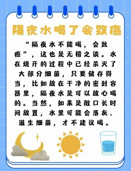 晨起饮水是很多人的习惯,但隔夜水暗藏健康风险,建议慎饮。 水放置超8小时,尤其敞口时,易落入灰尘、滋生细菌,室温下细菌数量会大幅增加,饮用后可能引发肠胃不适。 此外,反复加热的隔夜水,亚硝酸盐含量或升高。建议晨起喝新鲜开水,未喝完的水需加盖冷藏,存放不超过24小时。