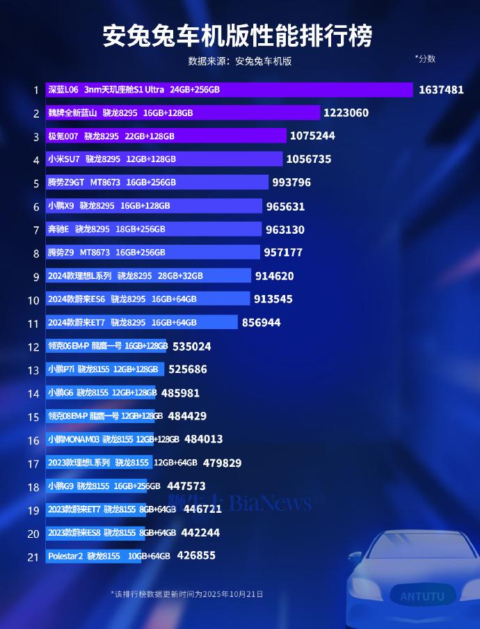 深蓝汽车官方今日宣布,深蓝L06凭借搭载的3nm天玑座舱S1Ultra芯片,以1637481分登顶安兔兔车机版跑分榜首,成为百万内车型中唯一采用3nm车规级座舱芯片的车型,这一成绩领先第二名超33%。