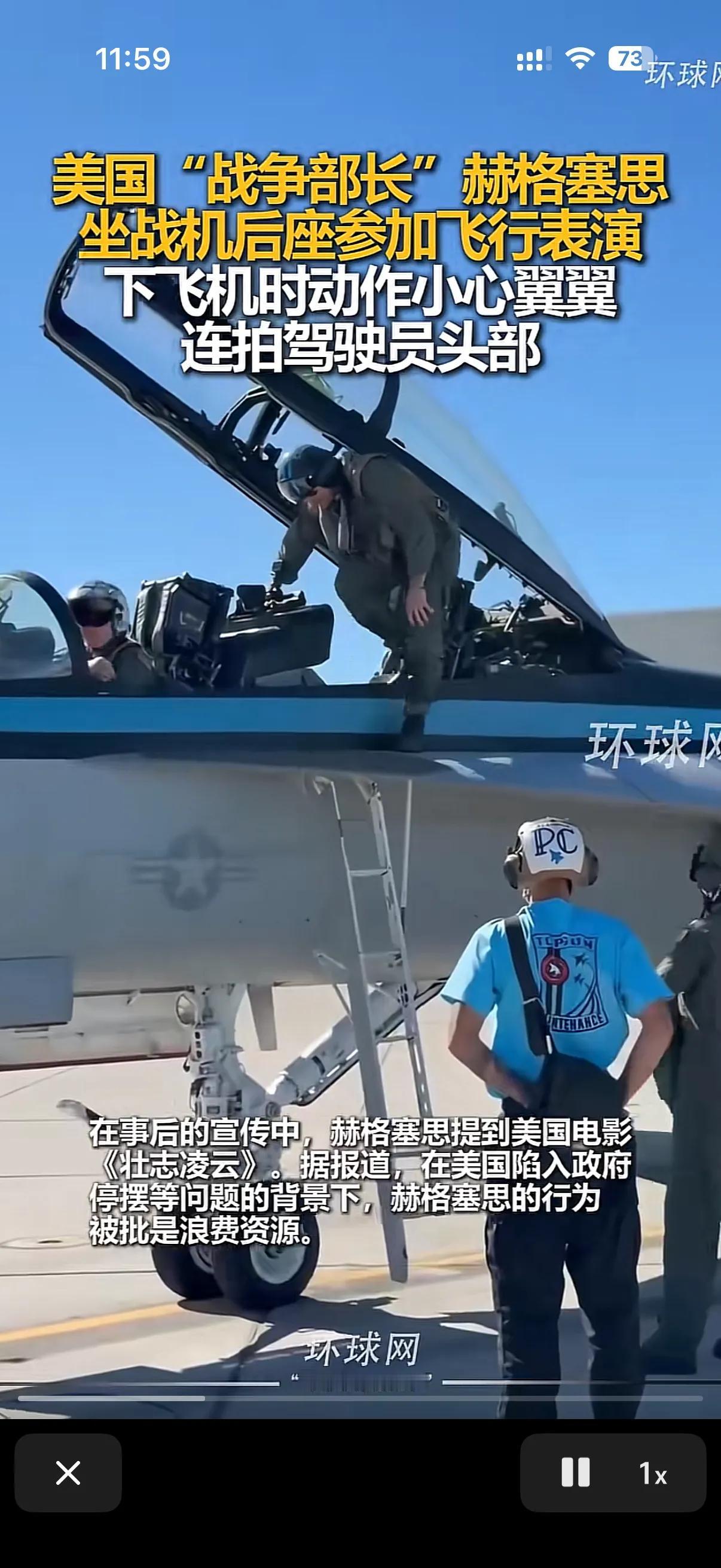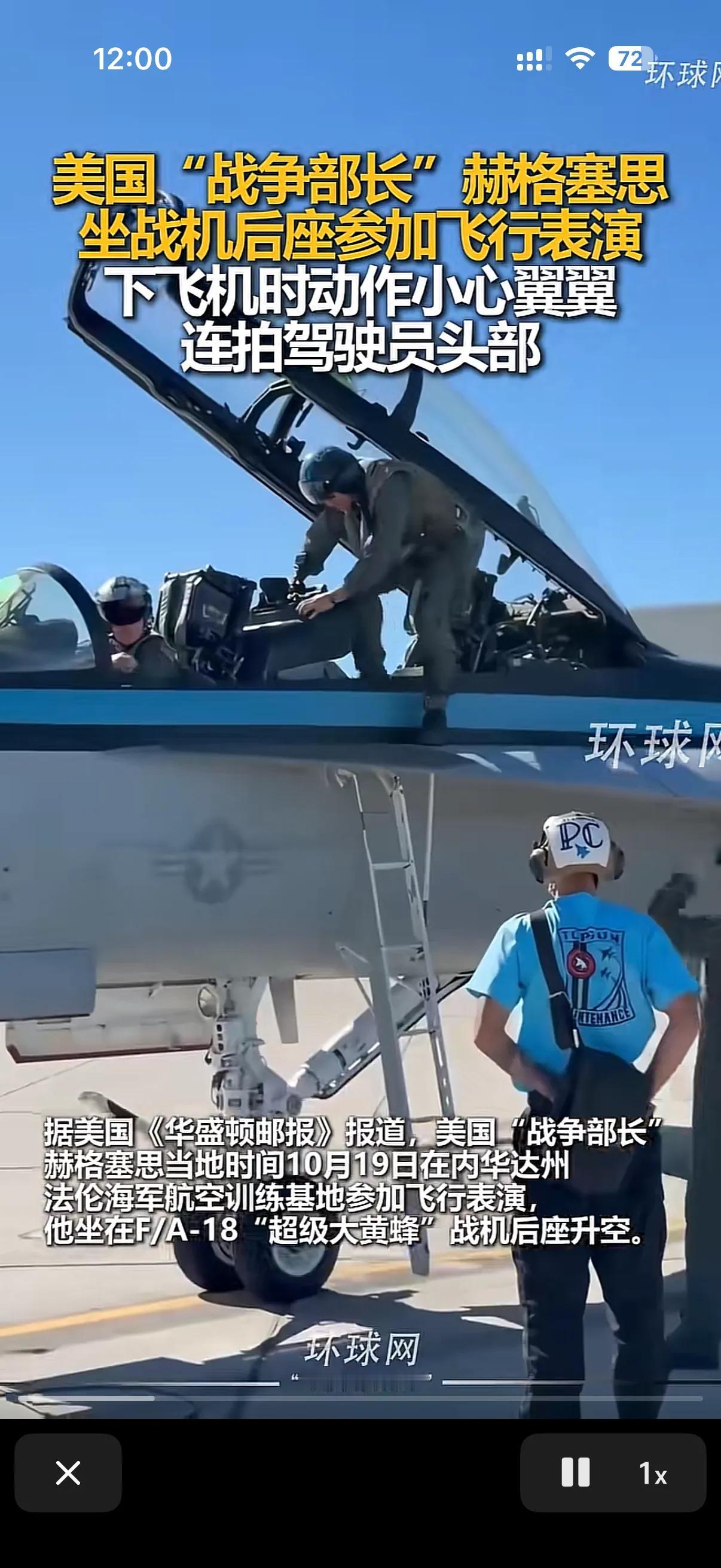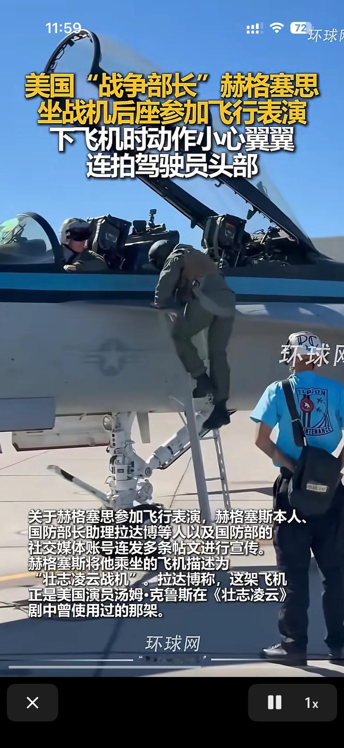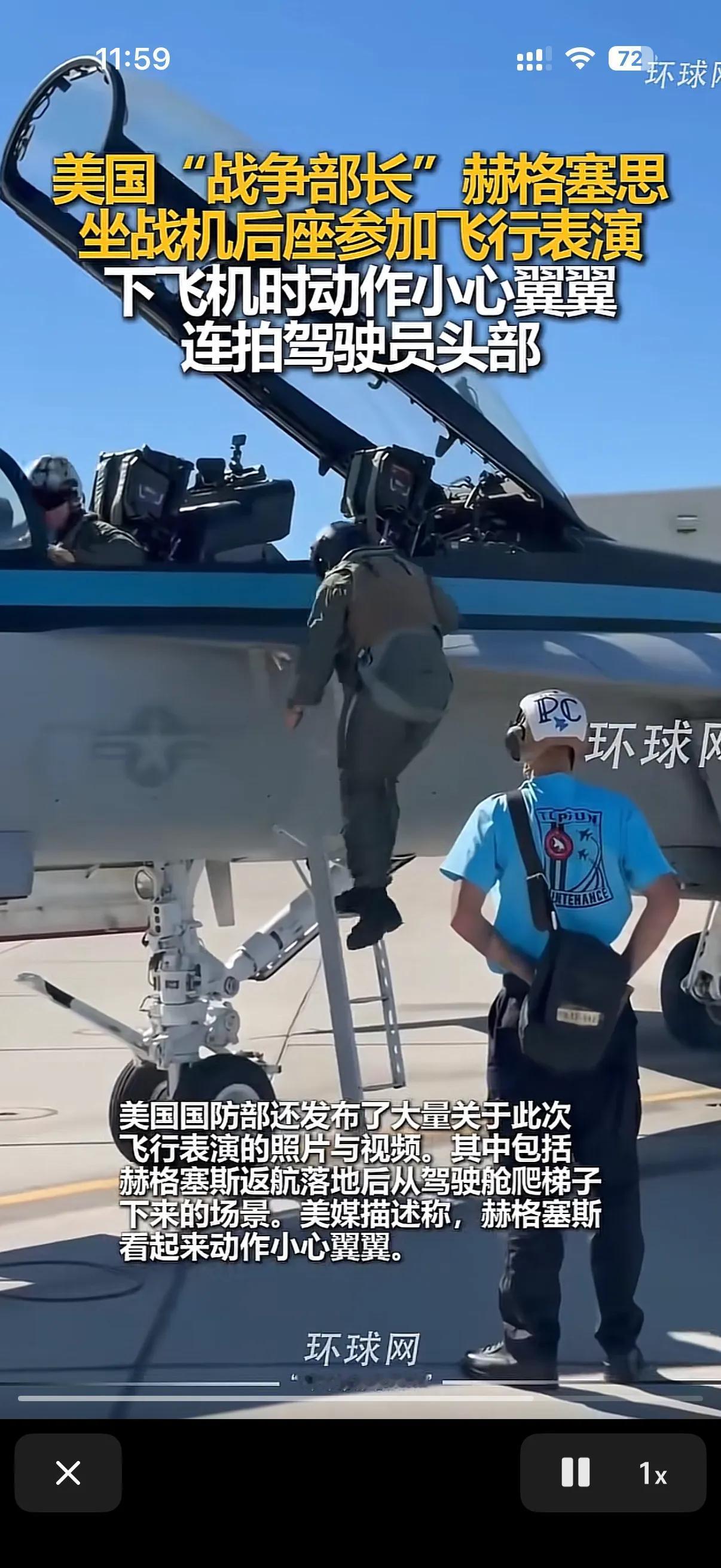 美国战争部长,就是那个配合特朗普把美国驻全世界将军都叫回来开会,然后让将军们都进行体能训练的原美国国防部长赫格赛斯,在坐美国战机后座参加飞行表演后,和上机时候的矫捷不同,在视频画面里,很明显的看出来,赫格赛斯在下飞机的时候显得小心翼翼很多,并且在下飞机的时候还拍了下飞行员的头盔! 有媒体解读这是赫格赛斯对飞行员的驾驶技术的肯定和鼓励,但是也有媒体说,在飞行表演的过程中,飞行员明显是动作过猛给赫格赛斯吃了暗亏,毕竟在军方里很多人对赫格赛斯抓考勤试体能训练抱有不满! 在事后的宣传发言中,赫格赛斯还特意提了美国电影壮志凌云,因为赫格赛斯所乘坐的战机正是美国演员汤姆克鲁斯曾使用过的那架,如果是巧合的话那可就真的很巧了!