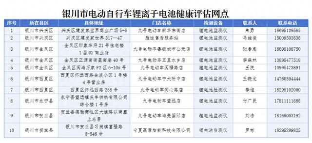 不少市民购买了电动车后,很少会关注电池的健康程度,也不知道应该到哪里去检测。现在大家不用担忧了,为降低电动自行车锂离子电池安全风险,减少电动自行车火灾事故发生,银川市依托电动自行车销售门店等,建立10个电动自行车锂离子电池健康评估服务网点,同时为便于居民检测电动自行车锂离子电池安全性,按照自治区统一部署,即日起,在全市范围开展电动自行车锂离子电池健康评估进社区进乡村活动。