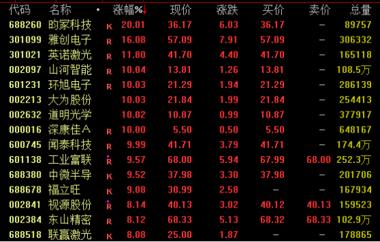消费电子概念盘中走势活跃,苹果概念股表现亮眼。截至收盘,昀冢科技20%涨停,雅创电子涨约16%,英诺激光涨近12%,山河智能、环旭电子、大为股份、闻泰科技等均涨停。