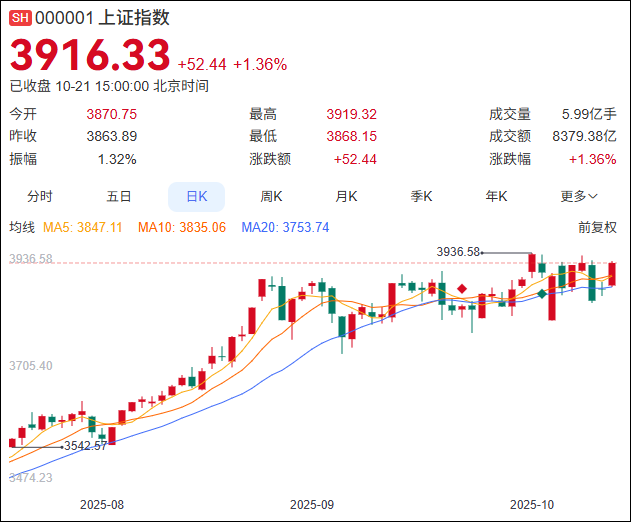 今日,A股三大指数普涨,富时中国A50指数期货涨幅扩大至2%。截至收盘,上证指数上涨1.36%,收复3900点整数关口;深证成指涨2.06%,创业板指则大涨3.02%。两市成交额达到18739亿元,较昨日放量1363亿元,上涨家数则超过4600只,市场赚钱效应明显。