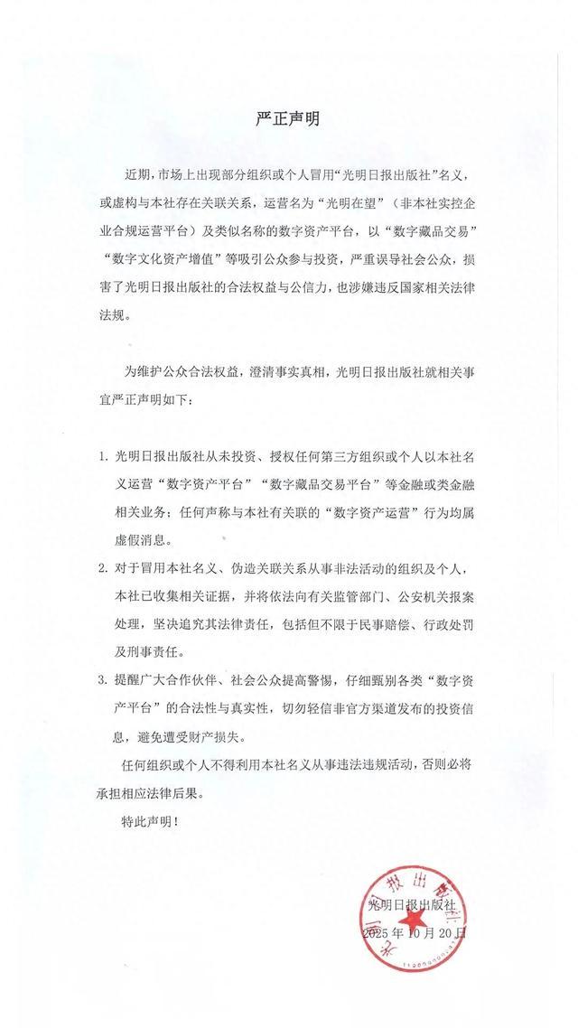 近期,市场上出现部分组织或个人冒用“光明日报出版社”名义,或虚构与本社存在关联关系,运营名为“光明在望”(非本社实控企业合规运营平台)及类似名称的数字资产平台,以“数字藏品交易”“数字文化资产增值”等吸引公众参与投资,严重误导社会公众,损害了光明日报出版社的合法权益与公信力,也涉嫌违反国家相关法律法规。
