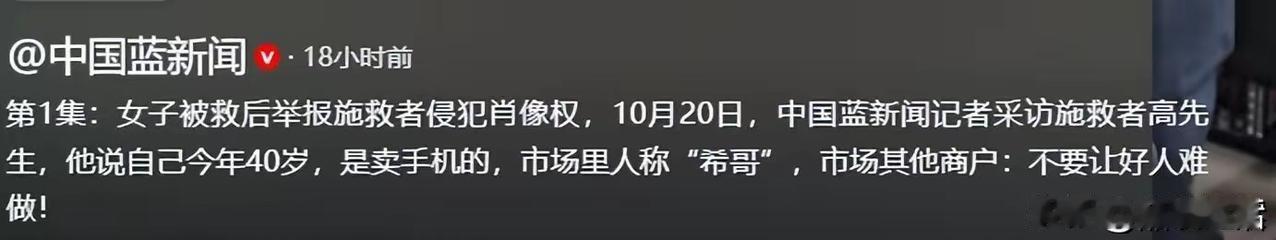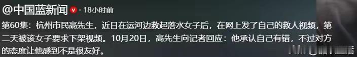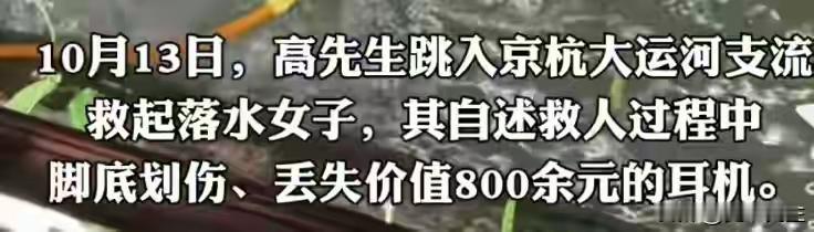 杭州高先生勇救落水女子,脚被划伤,自费打破伤风,还丢失800元耳/机,反被女子举报“侵犯肖像权”! 高先生40岁,是卖手机的,人称“希哥”,10.14晚,散步时,听到落水声,顾不得多想,脱掉棉鞋,跳进冰冷的水里,奋力把女子救出来,水里很滑,脚底被划伤,后来还去打了破伤风, 女子上岸后仅说了声“谢谢”,家属到来后,也并未对高先生受伤的事,和丢失耳/机表示关切! 现场有人录制了救人视/频,找到高先生,为了纪念第一次,救人! 高先生把它传到网上,想让大家夸夸自己, 结果,反被女子找到,加微信,态度强硬,没有一句感谢和商量,直接让让删掉视/频,更是后来举报,“侵犯她肖像权”! 高先生觉得很委屈,以后救人可以,视频还是不要发了! 有人说,女子太过分,这让好人难做,救人还要想想后果? 有知情/人说,女子本来告诉男朋友自己出差东北,人却出现在杭州,她怕被认出来,心里有鬼,才这么做的! 不管怎么样,都不能让好人寒心,谁也不能保证,还遇到像高先生一样的好人!