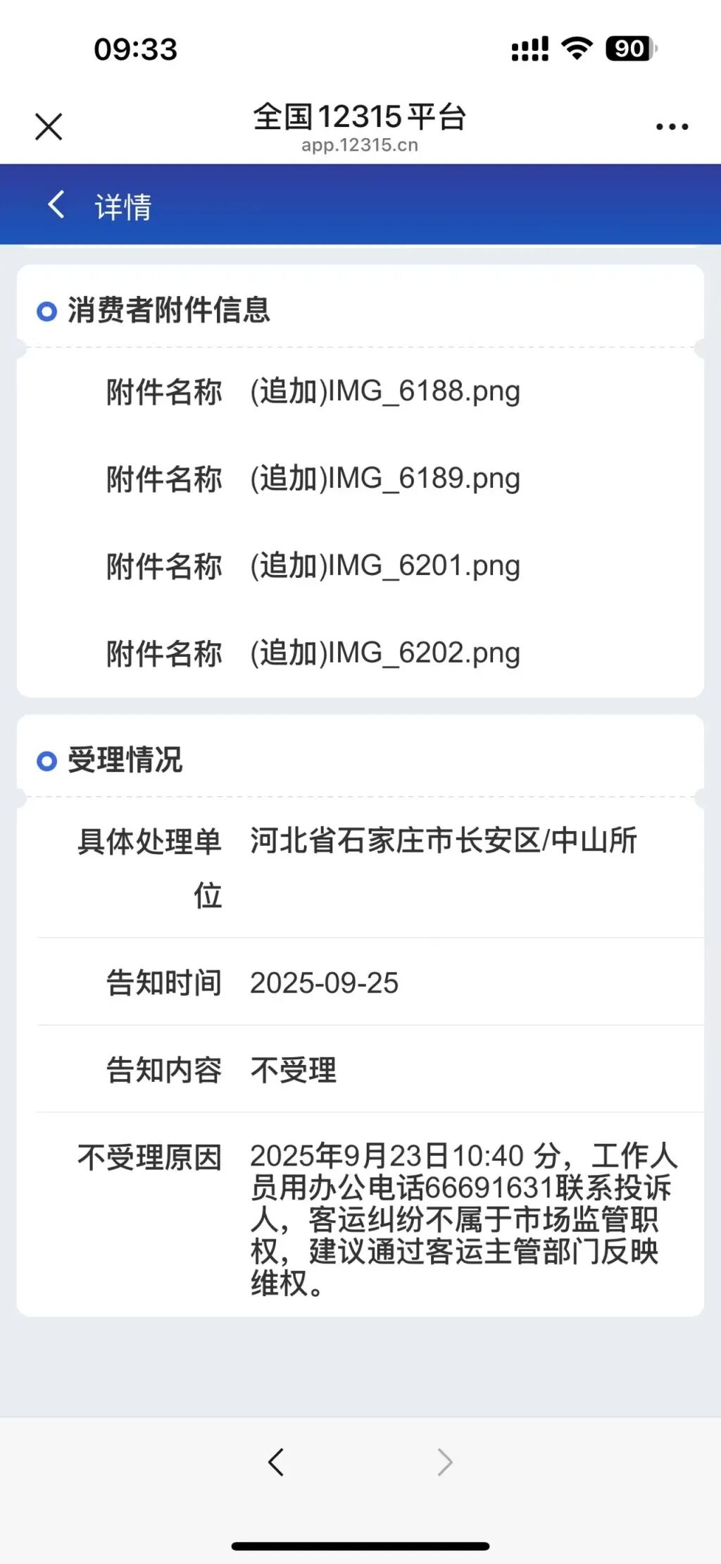 消费者投诉后,石家庄交通运输局的回复。