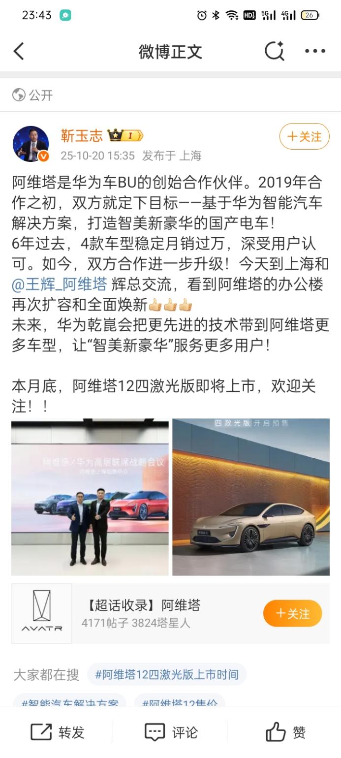 车圈又一大消息来了!华为车BU CEO靳玉志首访阿维塔新址,6年“神仙合作”要开启新篇章了! 和阿维塔要发新车相比,我更感兴趣这个事儿,靳玉志第一次去了阿维塔上海新办公楼!要知道华为乾崑和阿维塔合作6年了,这一次的拜访意味深长,说明“长期主义伙伴”要开启新阶段了! 2019年刚合作的时候,华为乾崑和阿维塔都还在摸索阶段,谁能想到能一路走到现在?4款车型卖得风生水起,月月都能稳定过万销量,靠的就是互相信任、不急于求成的劲儿,他俩这才是真长期合作的典范! 而且他们的合作深度真的超出想象。一开始就只是智能驾驶、智能座舱这些技术合作,现在连智能工厂(长安&华为5G工厂)都搞起来了,鸿蒙生态、用户运营,还有长安的制造、供应链资源,全整合到一块,形成了独有的完整出行生态。这合作程度,相当紧密! 靳玉志这趟去,又是一次高层的战略交流,和阿维塔敲定未来的合作方向。他微博里说要一起打造智美新豪华的国产电车。这要冲全球领先,凭着这6年攒下的默契和成果,我觉得这波还真能成! 华为乾崑